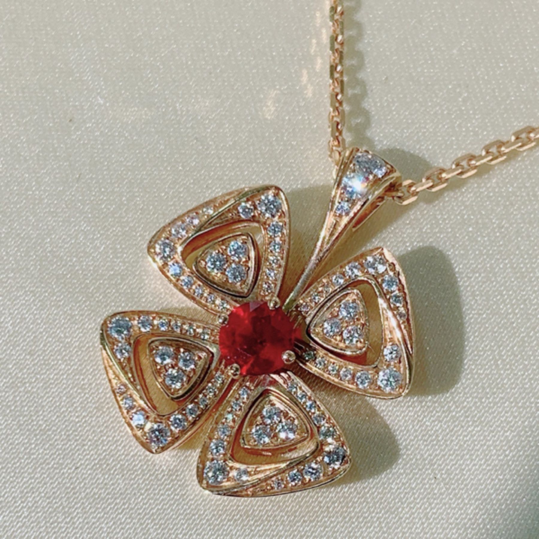 Fiorever咏绽系列18K玫瑰金红宝石钻石四瓣花项链
