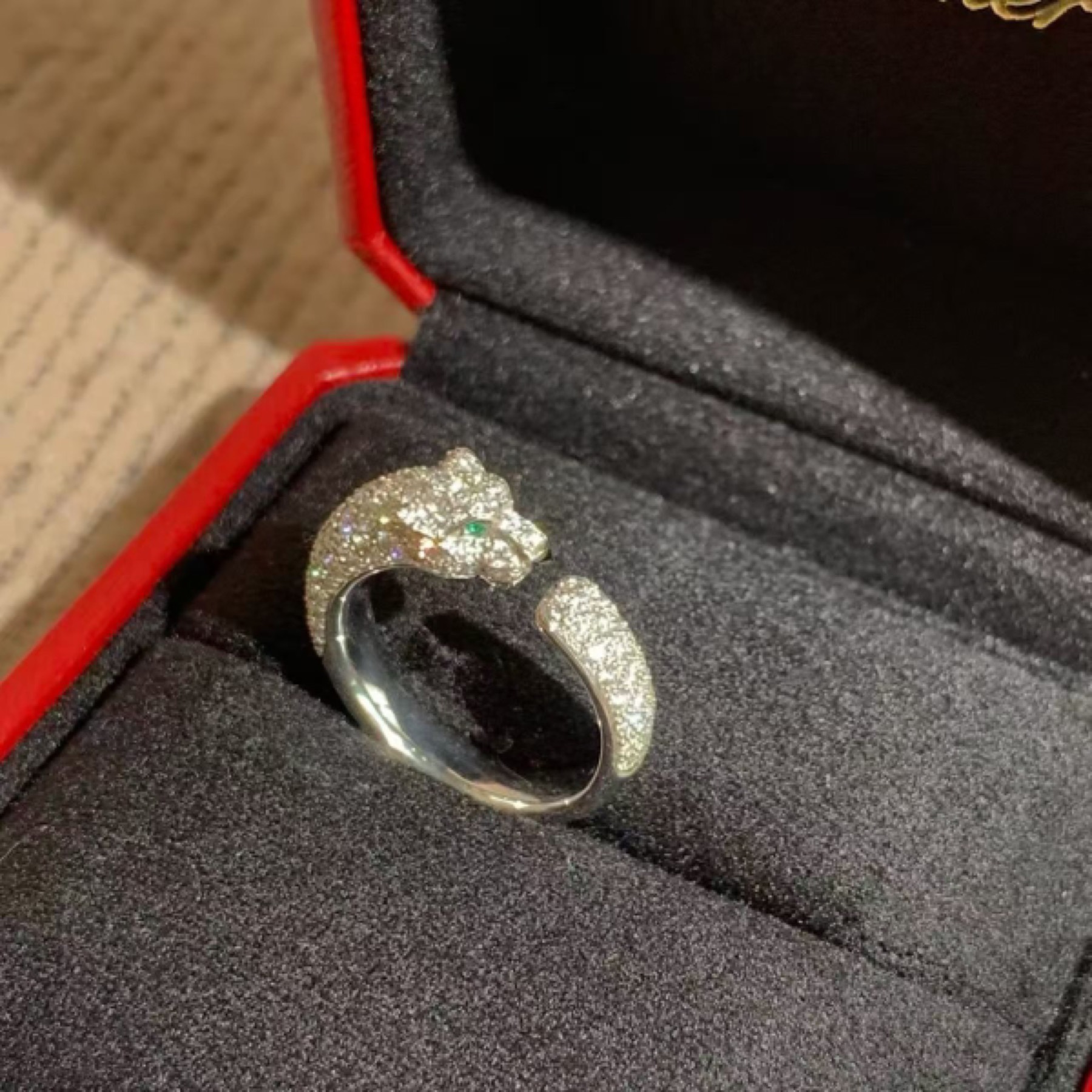 Panthère de Cartier小号18K白金祖母绿玛瑙钻石戒指